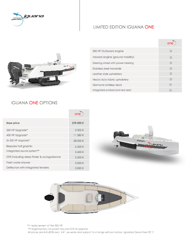 There are a number of additional options available so you can build your individual Iguana One to fit your lifestyle like the supercharged 400hp or the twin 200hp, Bespoke hull graphic, GPS including deep finder & autoguidance, Integrated sound system, Fresh water shower… we’ve got it covered.
